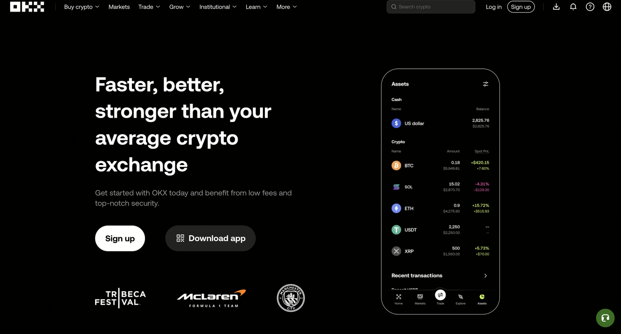 OKX est l'un des plus grands exchanges crypto internationaux avec un écosystème large. La plateforme offre le trading au comptant et sur marge, les contrats à terme USDT, les options, un marché P2P robuste, ainsi que des produits de revenu passif incluant le staking, les produits structurés et les programmes Earn. De plus, OKX développe activement sa direction Web3, incluant son propre portefeuille et l'accès aux applications décentralisées. Sans exigence de dépôt minimum pour les transferts crypto et une liquidité constamment élevée soutenue par des milliards de volume quotidien, il reste un concurrent fort.