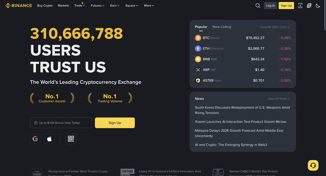 Binance est le plus grand exchange crypto par volume de trading, avec une base d'utilisateurs mondiale. La plateforme offre le trading au comptant et dérivés, les options, le staking, un launchpad, un service P2P, une plateforme NFT, et une large gamme de produits de revenu passif. L'exchange s'adresse à la fois aux débutants et aux traders professionnels qui apprécient les outils d'analyse avancés et de gestion des risques. Les dépôts minimums sont effectivement nuls pour les crypto, et sa liquidité inégalée dépasse 10 milliards de dollars quotidiennement en moyenne.