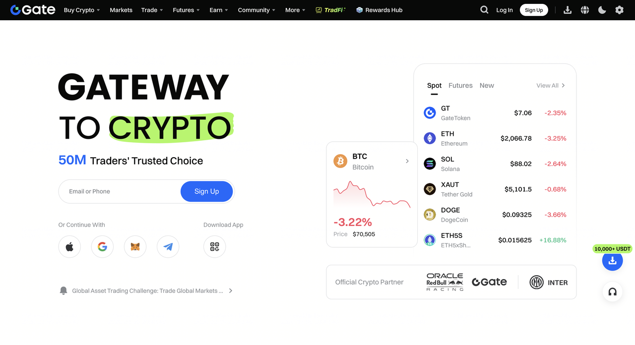 Gate se distingue par sa large sélection d'actifs numériques et ses listings rapides de nouveaux tokens. En plus du marché au comptant, la plateforme offre des dérivés, le trading sur marge, et des outils d'investissement supplémentaires. L'exchange développe également activement son launchpad, ses services de revenu passif, et ses produits pour participer aux projets en phase précoce. Les dépôts crypto n'ont pas d'exigence minimum, avec une liquidité solide soutenant une exécution rapide.